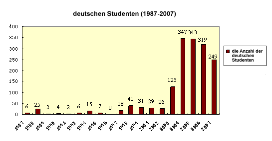Die wissenschaftliche Kooperation regt auch den Studentenaustausch an. Die ersten 6 deutschen Studenten kamen im Jahr 1987 an die Tongji-Universität. Nach der Statistik des Jahres 2006 hielten sich 319 deutsche Studenten auf dem Tongji-Campus auf. Sie kamen entweder über Stipendienprogramme oder über Hochschulkooperationen. Die Free-Mover waren dabei in der Minderzahl. Die folgende Grafik soll einen Überblick über die Anzahl der deutschen Studenten an der Tongji-Universität verschaffen.