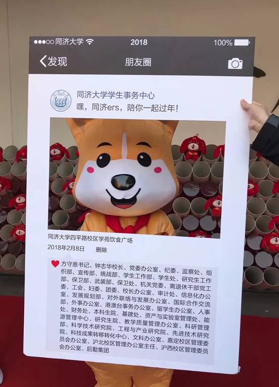 8. Februar (23.12 nach dem chinesischen Kalender) ist auch das traditionelle chinesische kleine Frühlingsfest. Heute Nachmittag ist Xueyuan (eine Mensa im Siping-Campus) sehr bunten und lebhaften dekoriert und voller Atmosphäre des Fests. Mehr als 400 Unileiter, Lehrer und Studierende kommen zusammen, um das Frühlingsfest zu feiern.