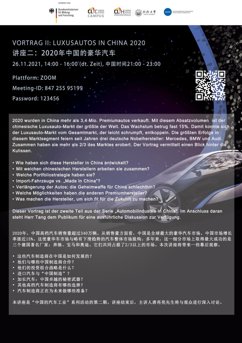 Dieser Vortrag ist der zweite Teil aus der Serie „Automobilindustrie in China“. Im Anschluss daran steht Herr Tang dem Publikum für eine ausführliche Diskussion zur Verfügung.