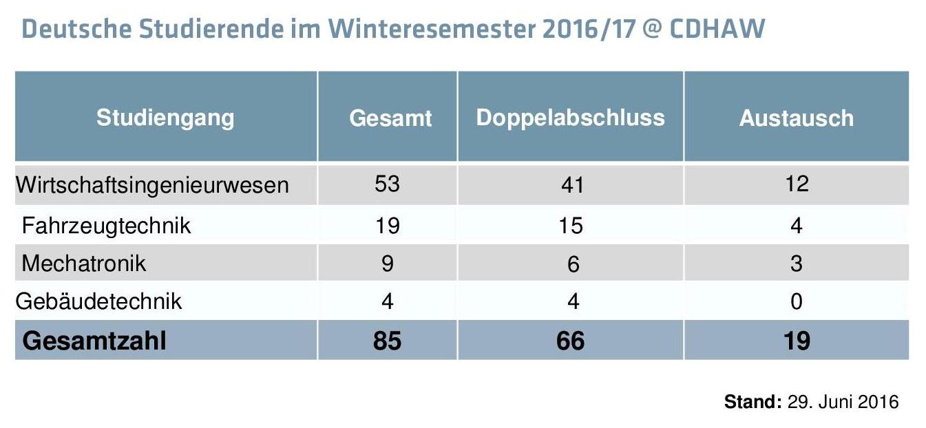 Am 9. September 2016 begrüßte Prof. Dr. Feng Xiao, Direktor der CDHAW, 85 Studierende der 27 Partnerhochschulen aus Deutschland und erstmals auch der Schweiz bei der Einführungsveranstaltung an der CDHAW. 66 angehende Ingenieurinnen und Ingenieure werden zwei Semester in China bleiben und streben den sehr begehrten Doppelabschluss an.